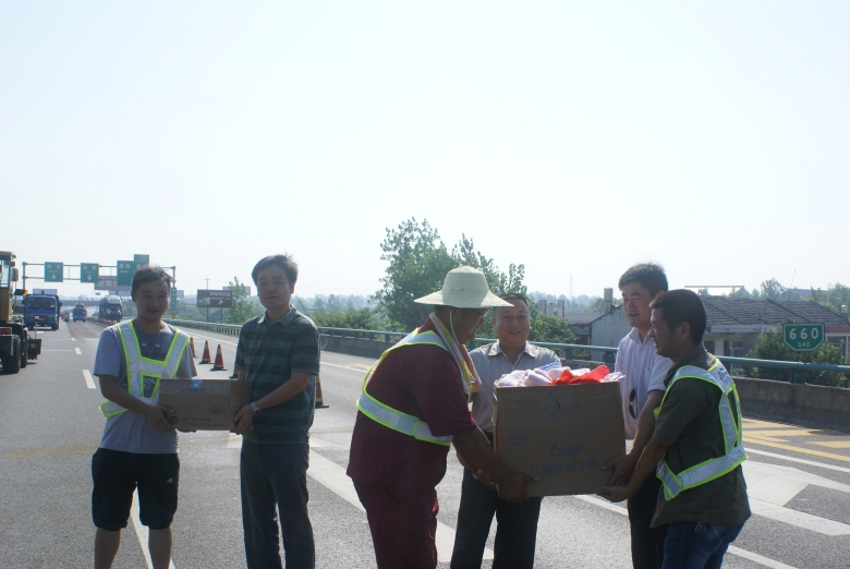連日來,氣溫節(jié)節(jié)攀升,酷暑考驗著堅守在合六葉高速公路養(yǎng)護工程施工一線的職工。8月8日上午,公司領導及工會一行帶著毛巾、花露水、洗發(fā)液、香皂,急救藥箱及防暑降溫物品來到高速公路施工現(xiàn)場,親切慰問在烈日下仍辛勤地工作在工程施工最前線的一線職工??偨?jīng)理萬世林詢問了他們在高溫天氣下的工作、生活情況,叮囑職工在當前持續(xù)高溫的不利條件下,安全做好工作的同時,注意休息,勞逸結(jié)合,合理調(diào)整工作作息時間,采取有效的防暑措施,安全順利地度過高溫季節(jié),保質(zhì)保量的完成施工任務。