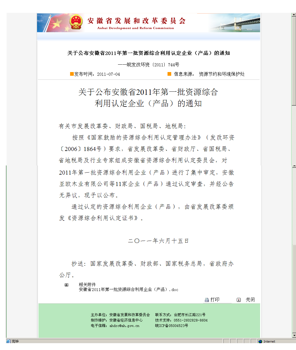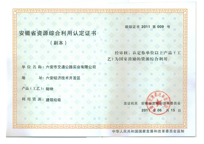 六安市交通公路實(shí)業(yè)有限公司在路面大中修中利用瀝青路面冷再生技術(shù)綜合利用廢棄的建筑垃圾,實(shí)現(xiàn)了老舊路面固體廢棄物回收再利用。被認(rèn)定為2011年安徽省第一批資源綜合利用企業(yè),省發(fā)改委頒發(fā)《資源綜合利用認(rèn)定證書》。