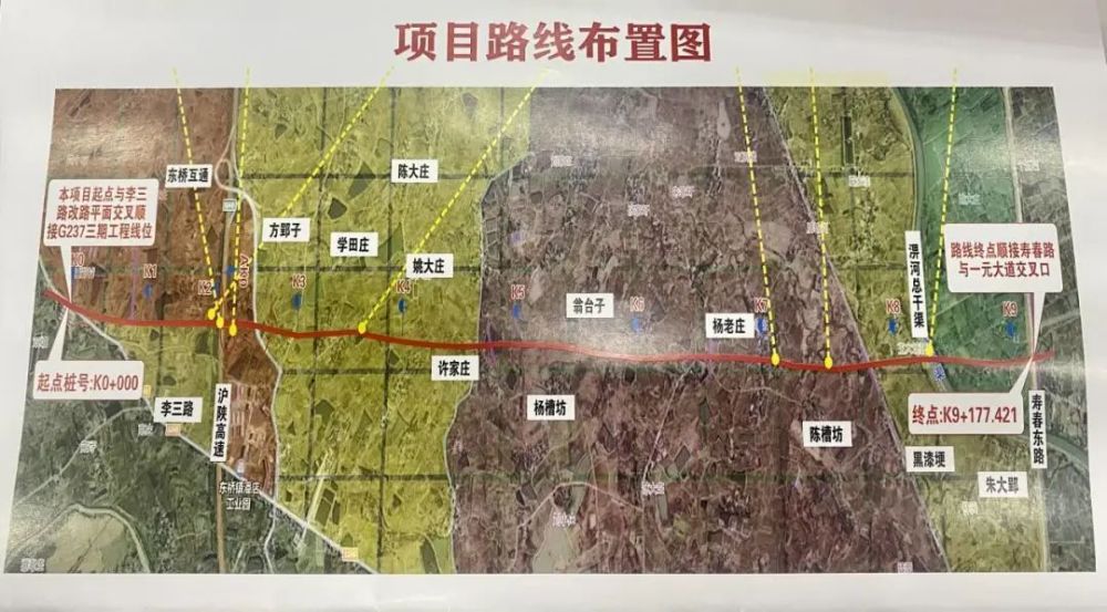 新建段全長(zhǎng)約9.2公里,采用一級(jí)公路標(biāo)準(zhǔn),設(shè)計(jì)速度為80km/h。東橋鎮(zhèn)李三路至東橋互通段長(zhǎng)約2公里,雙向四車道(跨G40橋梁采用雙向六車道),設(shè)計(jì)時(shí)速80公里/小時(shí),路基寬25.5米;東橋互通至壽春路段長(zhǎng)約7.2公里,采用“主六輔四”按照一級(jí)公路兼顧城市道路功能標(biāo)準(zhǔn)建設(shè), 設(shè)計(jì)時(shí)速60公里/小時(shí),路基寬53米;設(shè)互通立交1處2座橋,大橋2座,中小橋梁3座。采用瀝青混凝土路面。
